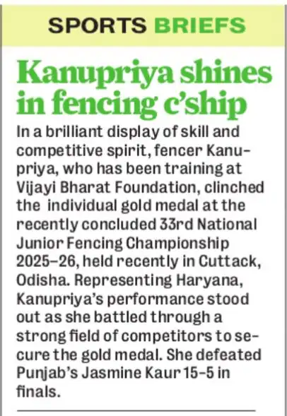 Vijayi Bharat Foundation Fencer Kanuprya wins back-to-back National medals Ahmedabad/Cuttack In a brilliant display of